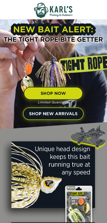 Karl's Bait & Tackle enables passionate anglers like Karl Von Dibble to discover amazing new fishing products and save money on the sport they love most. I worked on this brand as a Visual Designer updating the website’s homepage, footer, and marketing emails.